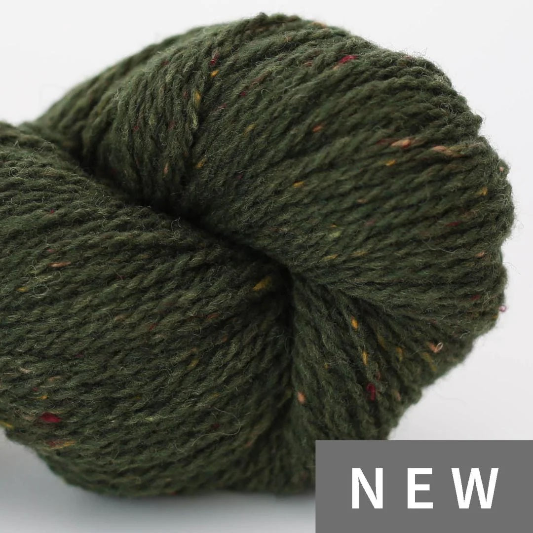 Als Streichgarn gesponnen mit Tweednoppen, also schön voluminös mit langer Lauflänge für leichte Strickstücke.